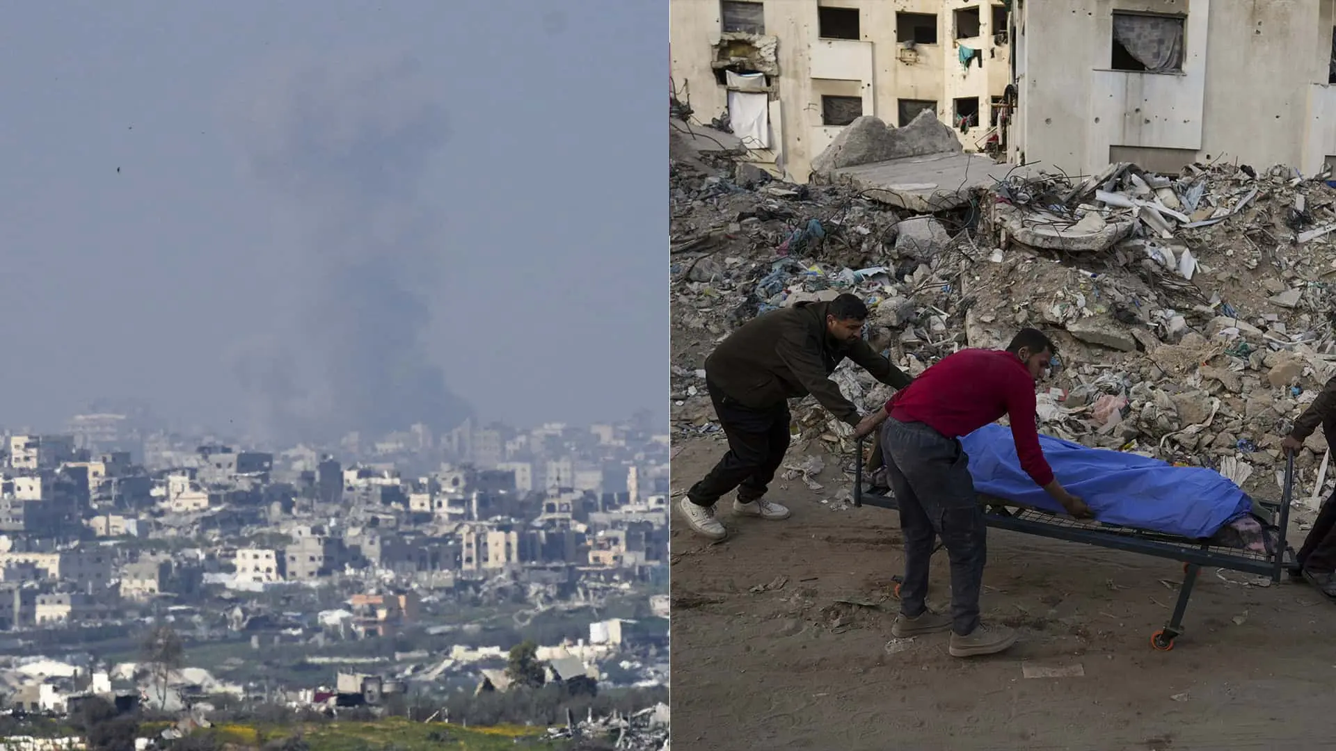 Na snímke vľavo stúpa dym po izraelskom bombardovaní v severnej časti pásma Gazy pri pohľade z južného Izraela, utorok 18. marca 2025. Na snímke vpravo Palestínčania prevážajú zraneného do nemocnice. Zdroj: TASR/(AP Photo/Ohad Zwigenberg/Abdel Kareem Hana)