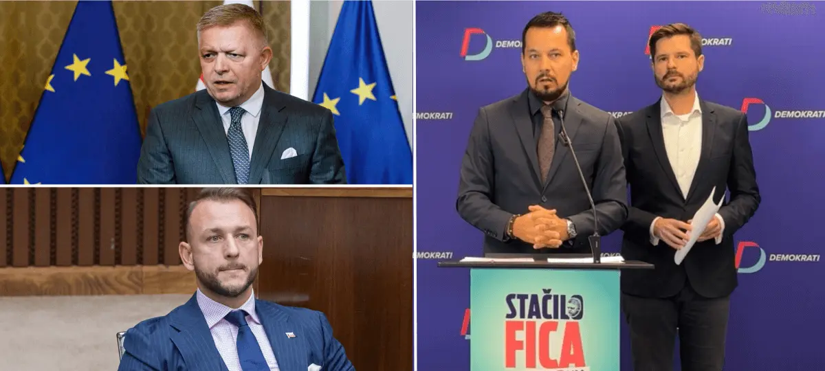 Vľavo premiér Robert Fico a minister vnútra Matúš Šutaj Eštok. Vpravo podpredseda strany Demokrati Juraj Šeliga. Foto: TASR/Martin Baumann, Dano Veselský