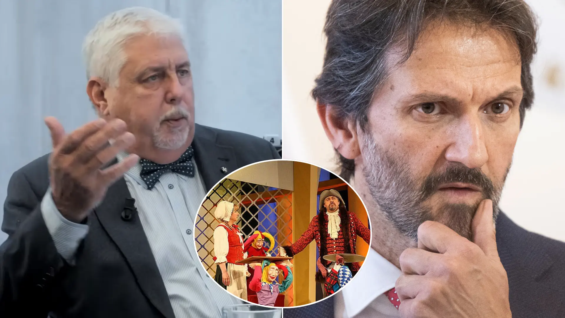 Humorista Oliver Andrásy, minister obrany Robert Kaliňák. V krúžku Andrásy a Elena "Eňa" Vacvalová v programe Dereš. Foto: TASR/Martin Baumann, YouTube/PubliQ , Archiv TV Markíza